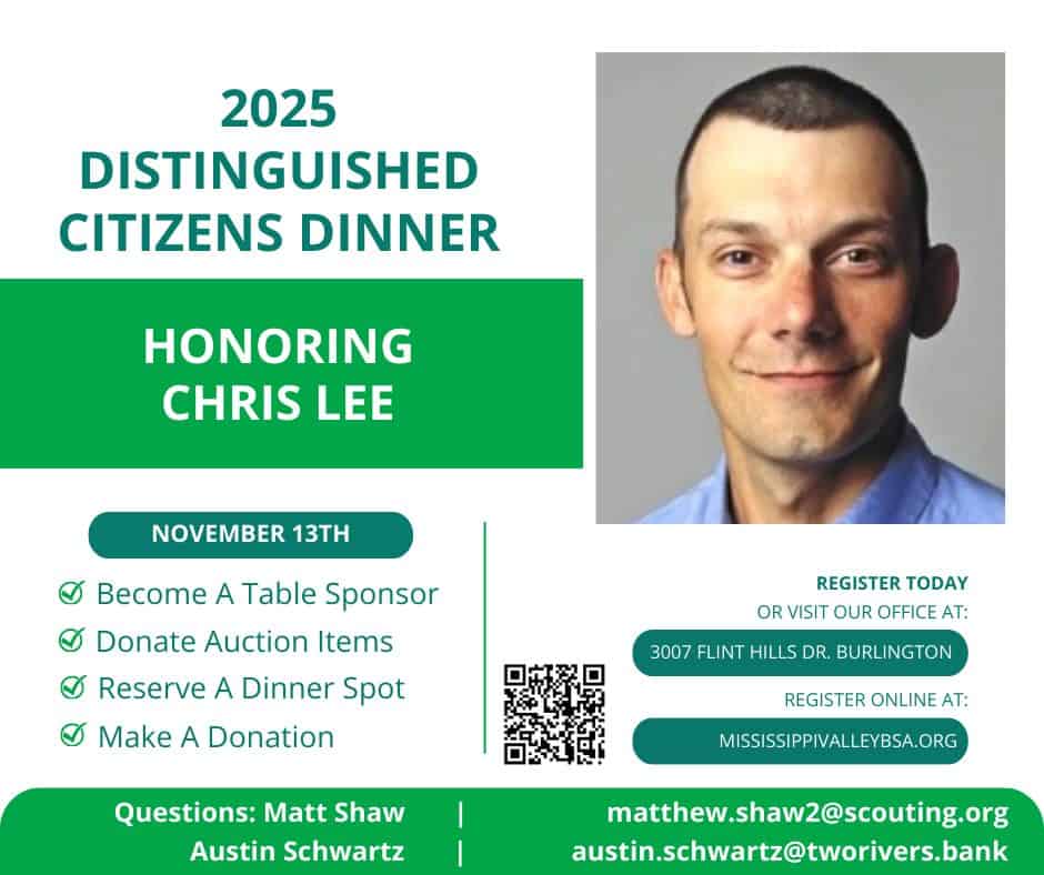This annual event is a major fundraiser for the Scouting America Mississippi Valley Council. Funds from this dinner will help instill lifelong character development in youth in the Des Moines County area. Please choose a support level below and help us honor Mr. Chris Lee.