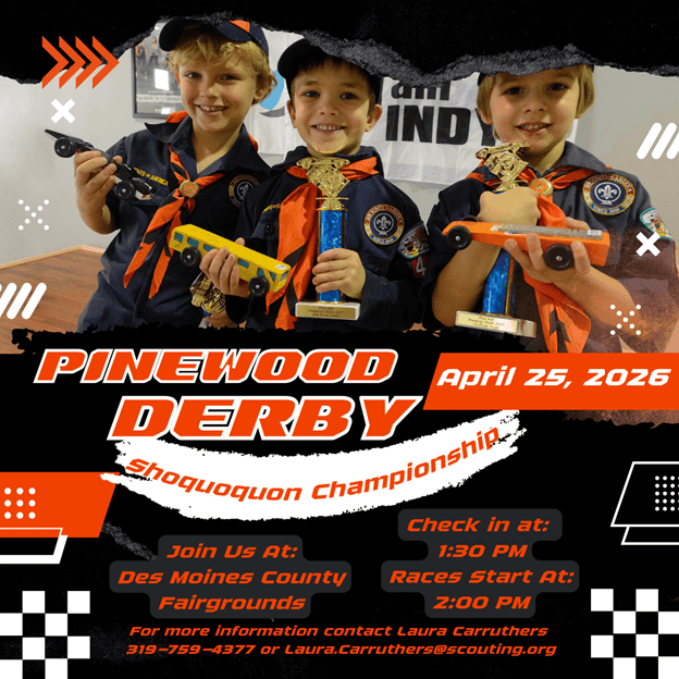 Join us at the Des Moines County Fairgrounds on April 25th for the Shoquoquon District Pinewood Derby.